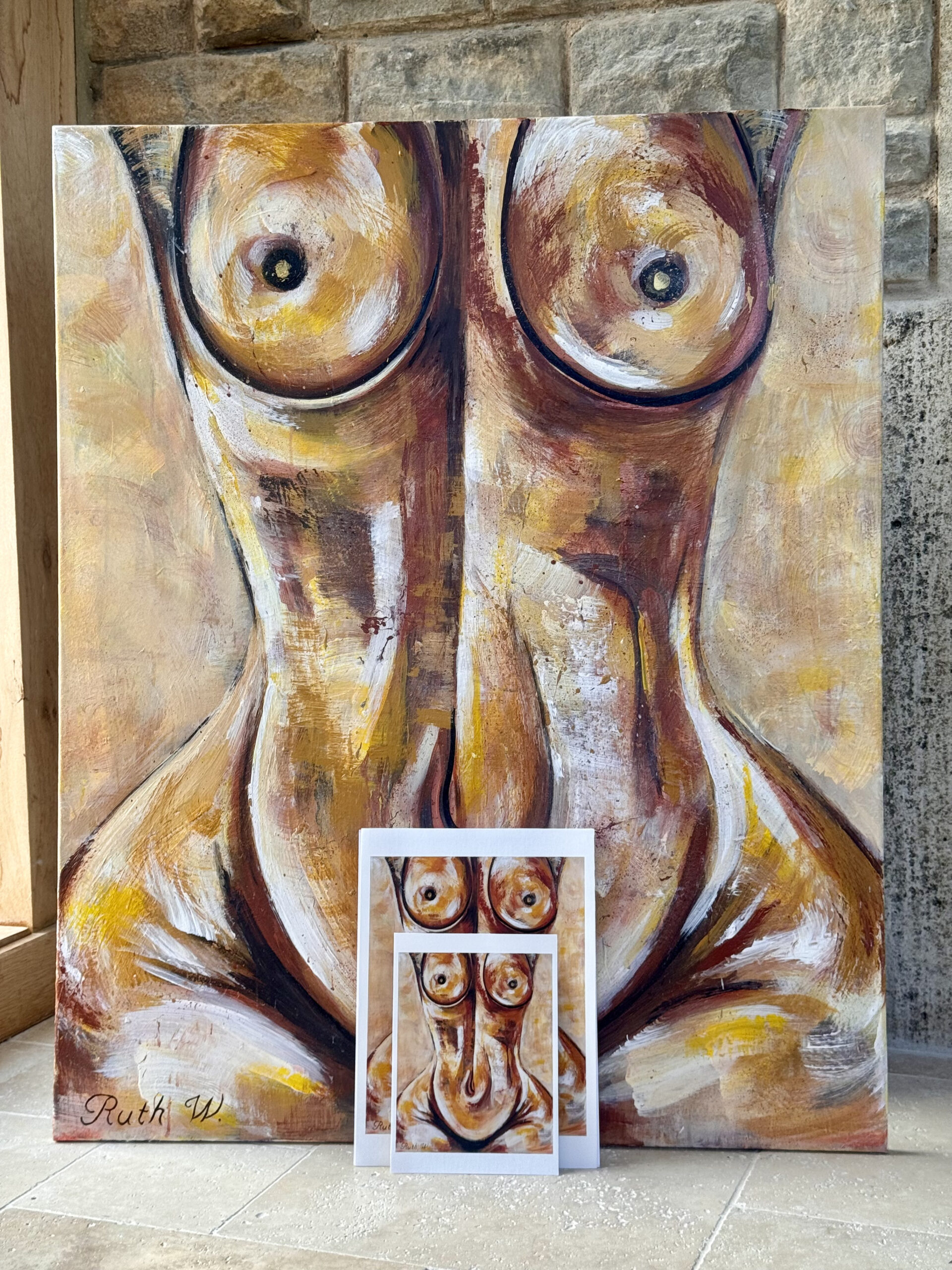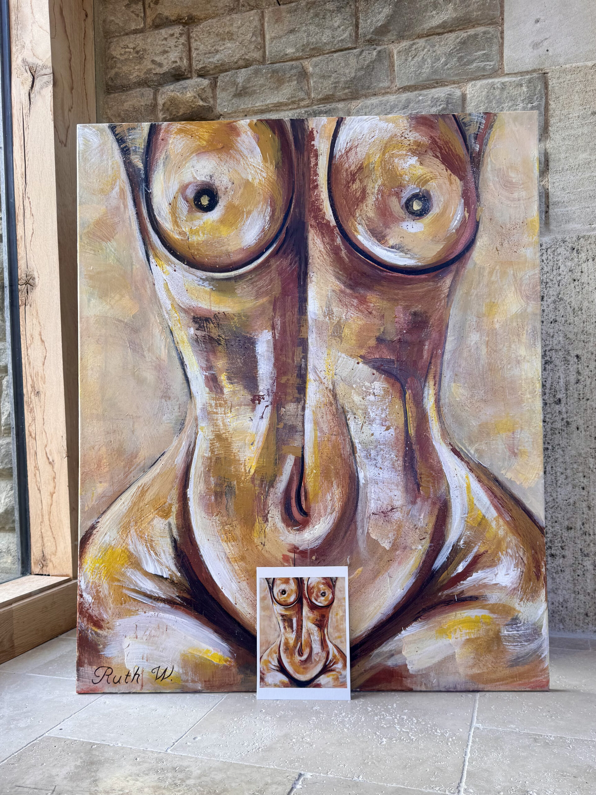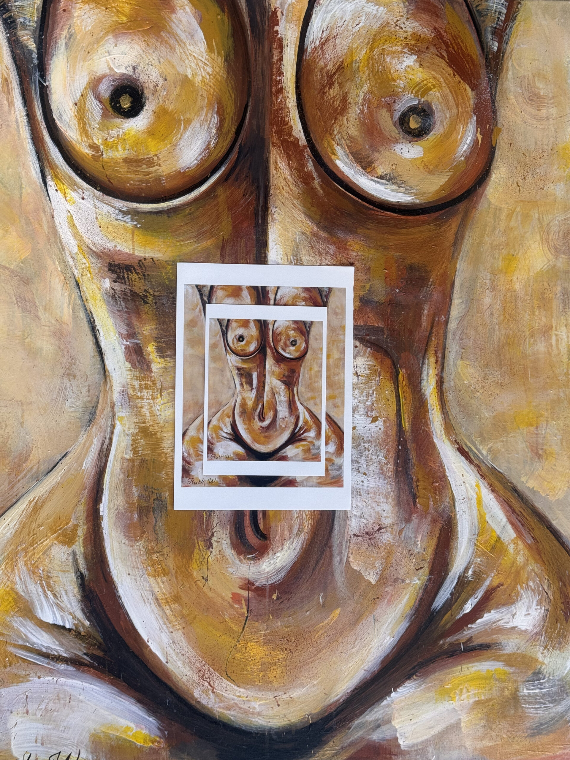The figure’s bold, curvaceous form dominates the composition, rendered in warm golden tones that both celebrate and question the idea of perfection. Light and shadow are used to create depth and contrast, encouraging closer inspection. Smooth and raw textures sit side by side, reflecting the layered experience of self-perception.