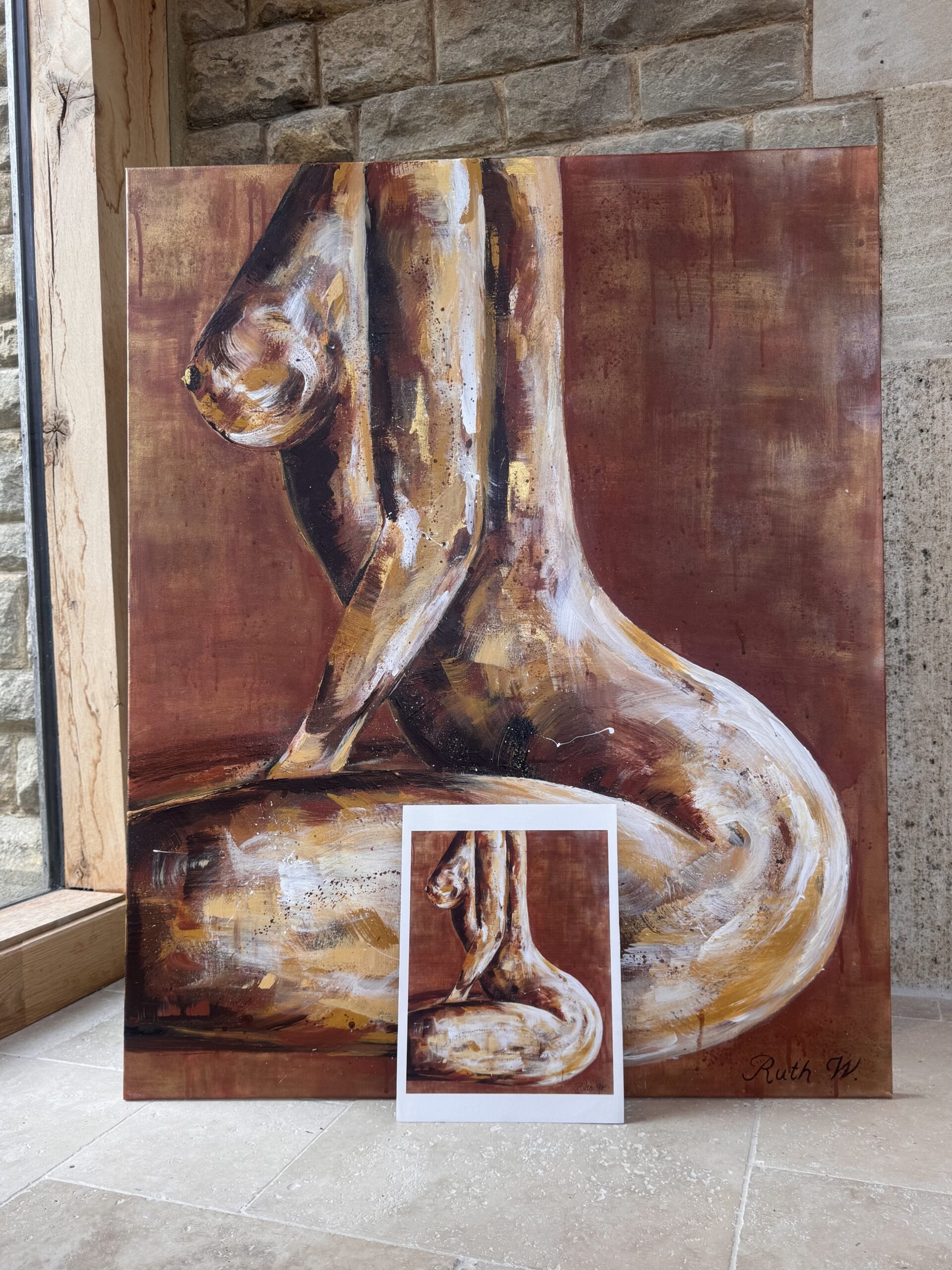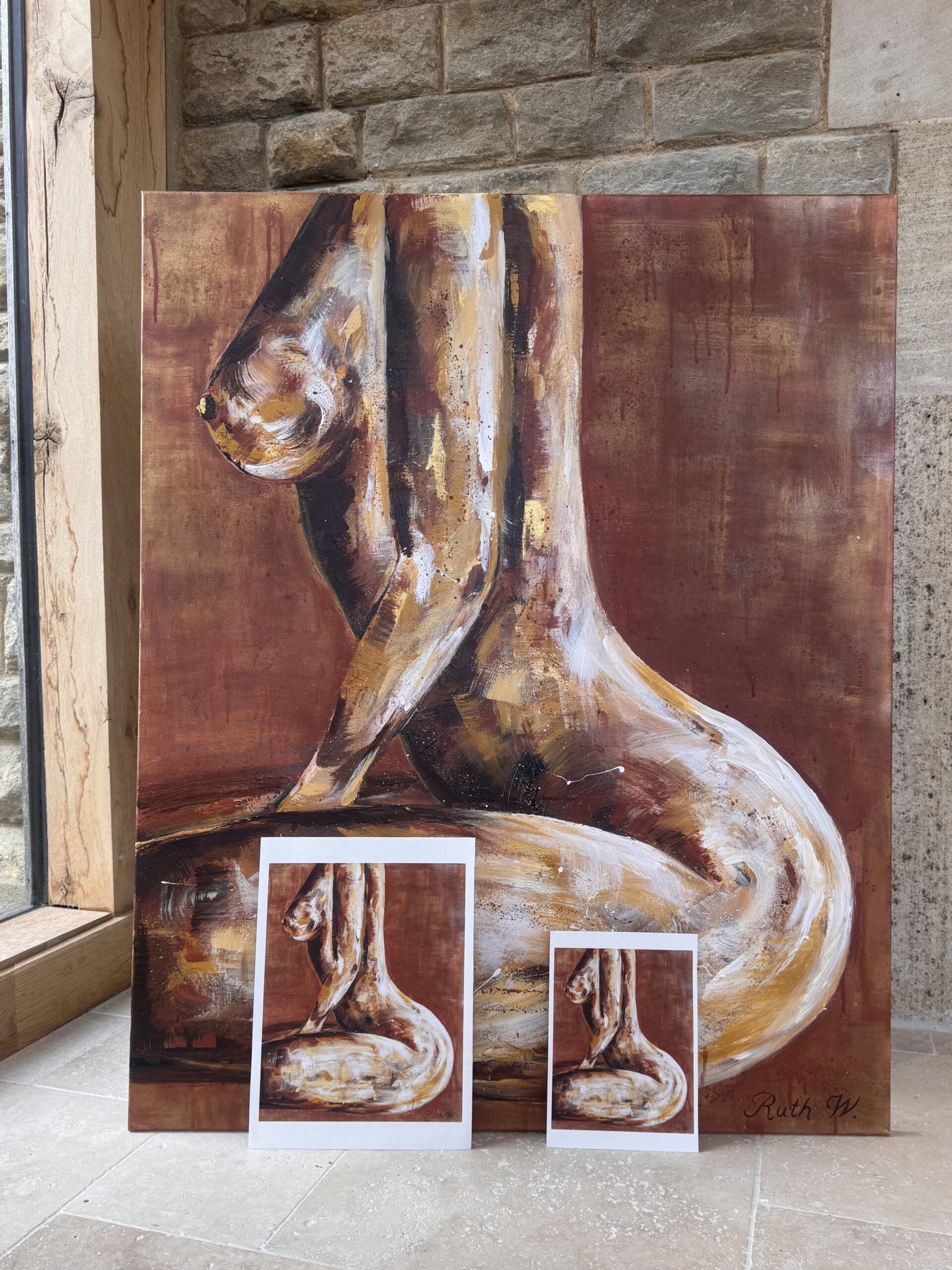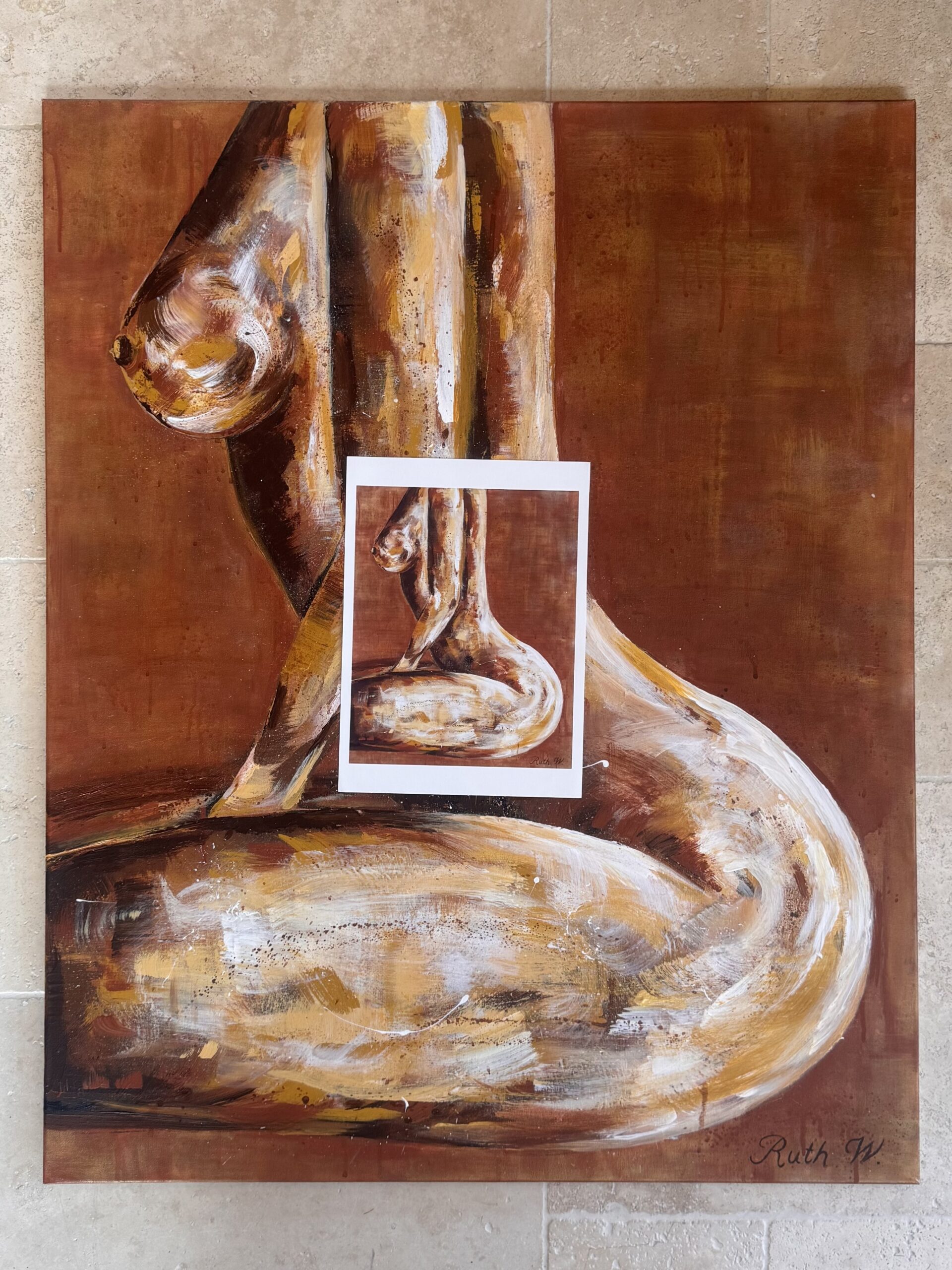 Layered brushstrokes create depth, inviting the viewer to look closer and revealing emotional complexity beneath the surface. This technique mirrors the figure's internal conflict, as though she has yet to fully embrace herself. The uncomfortable, forced pose highlights the tension between external expectations and personal expression, while the fusion of the figure and her environment amplifies the struggle to reclaim personal power.
