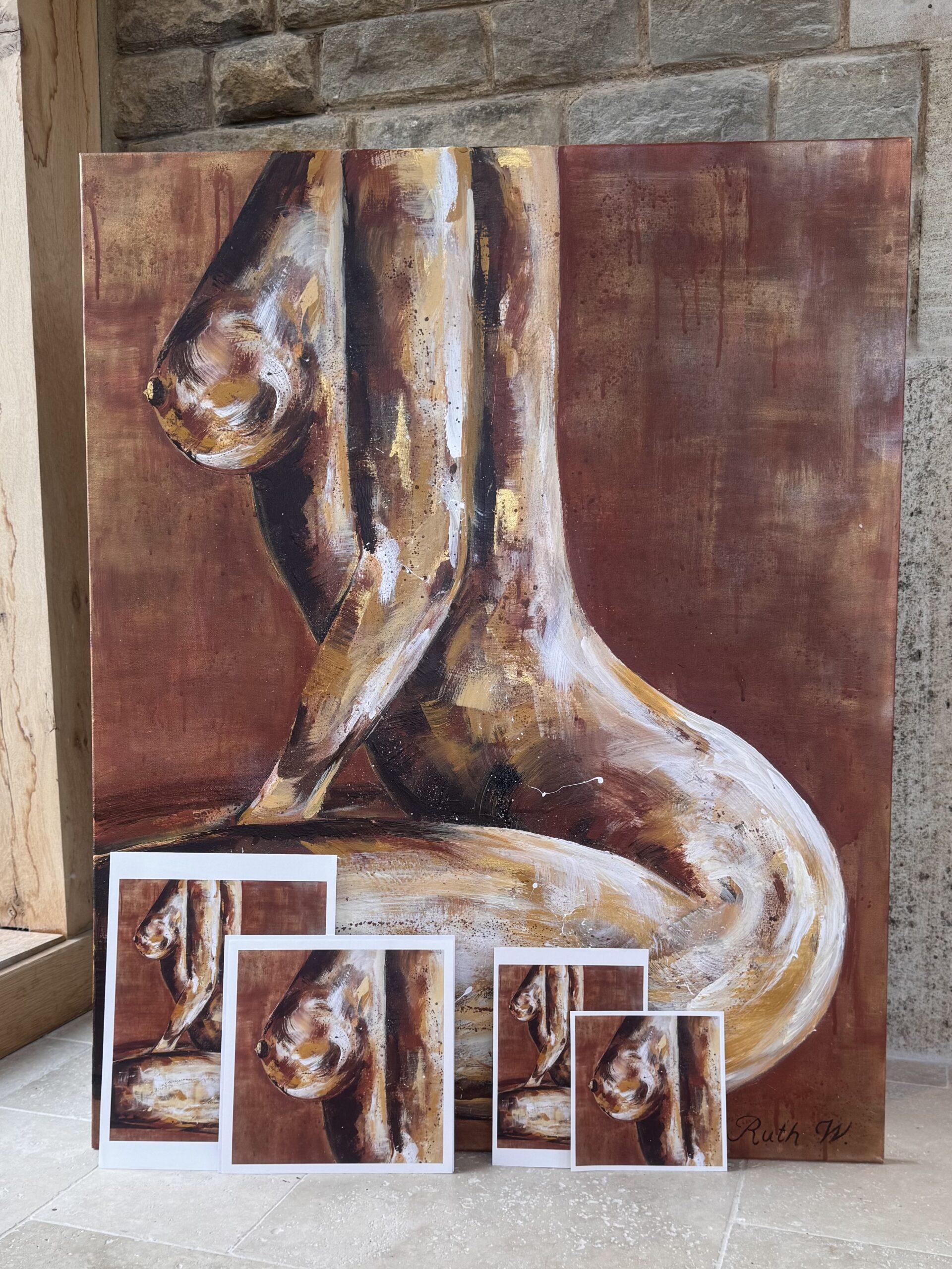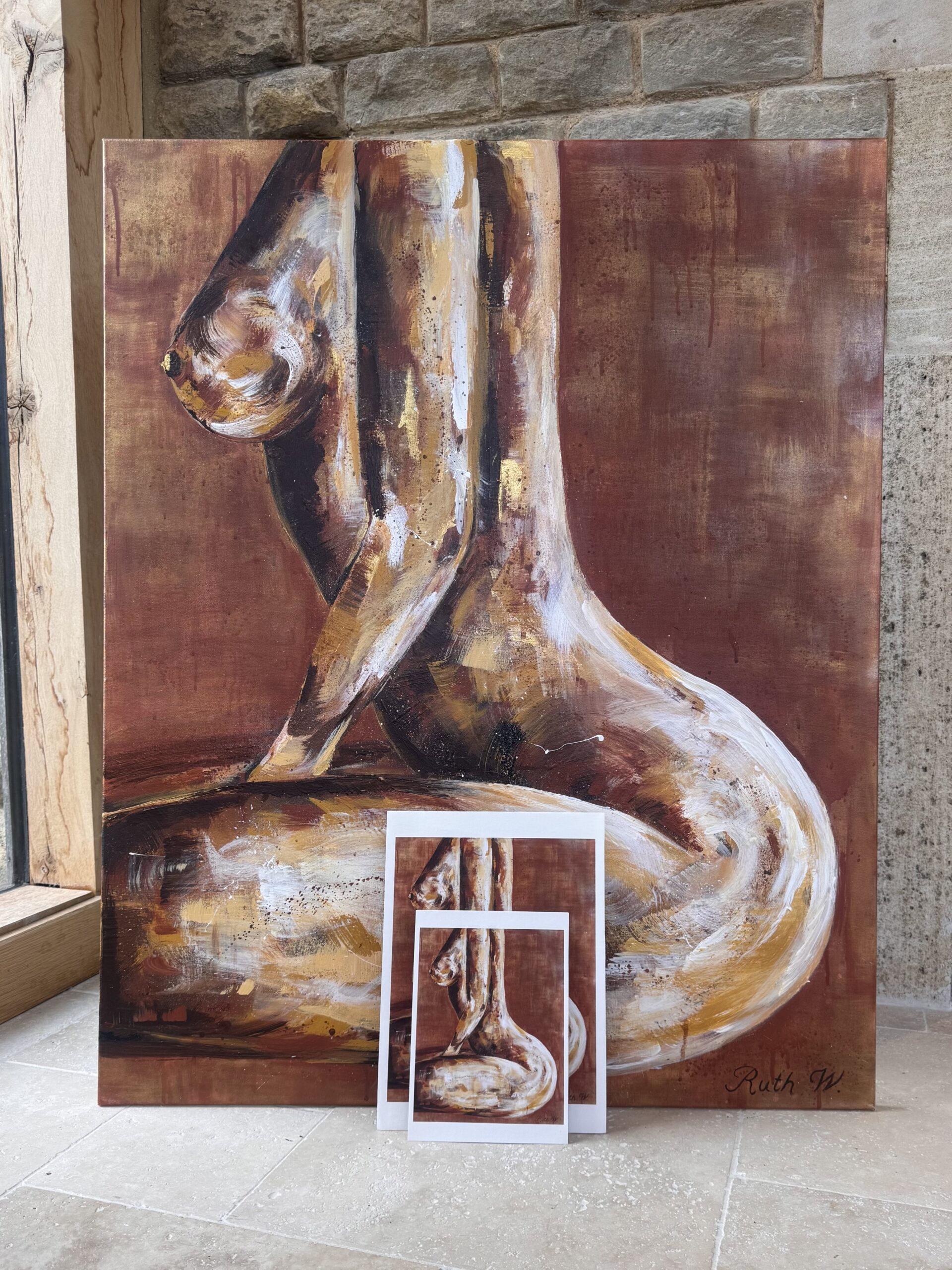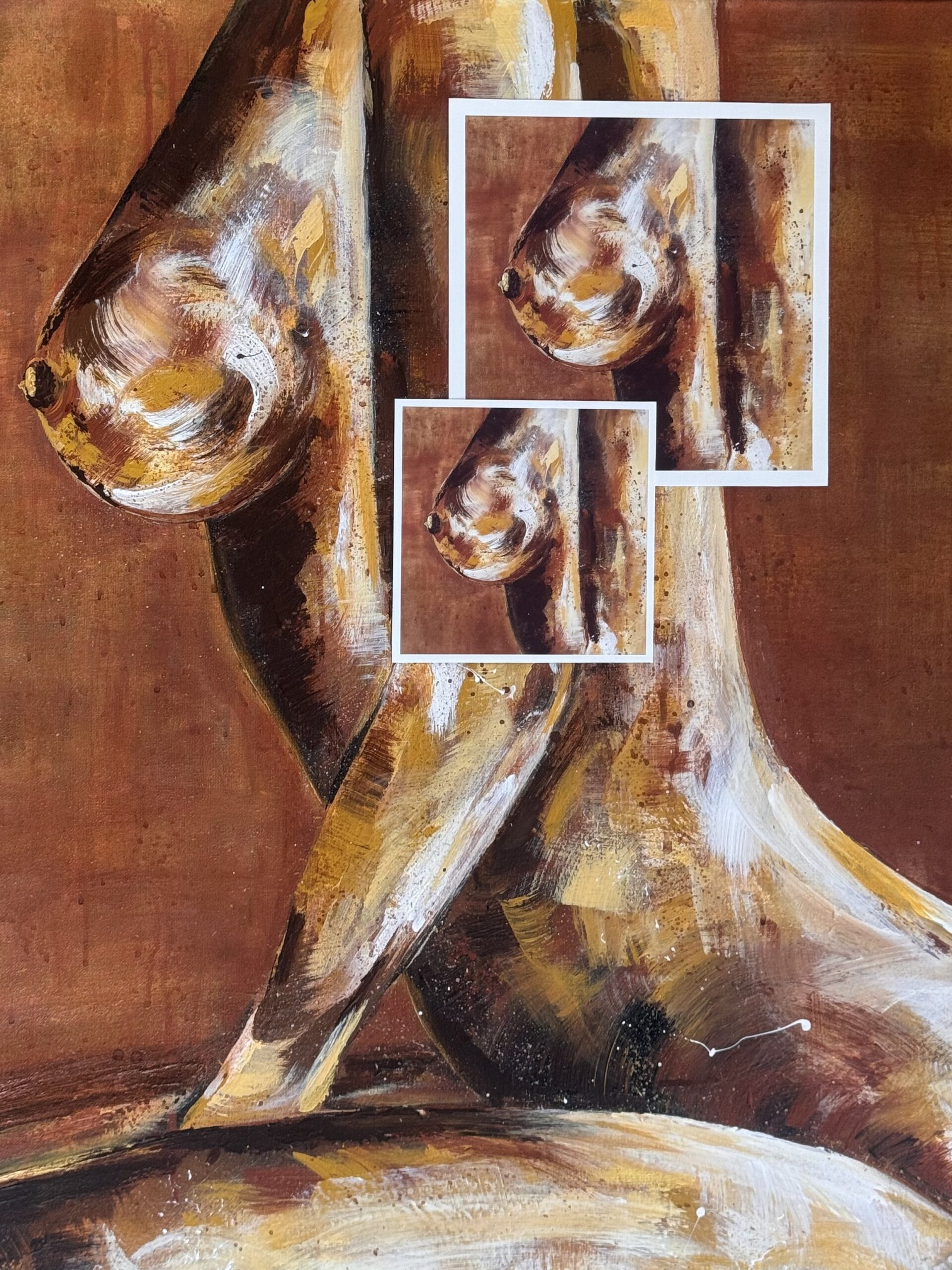 The warm, earthy tones – ochre, brown, and white – carry a grounding presence while subtly suggesting a desire to fit within conventional expectations. These neutral hues symbolise conformity to societal ideals of femininity, where women are expected to be demure and unthreatening. The figure blends with the background, emphasising a loss of individuality and the pressure to conform.