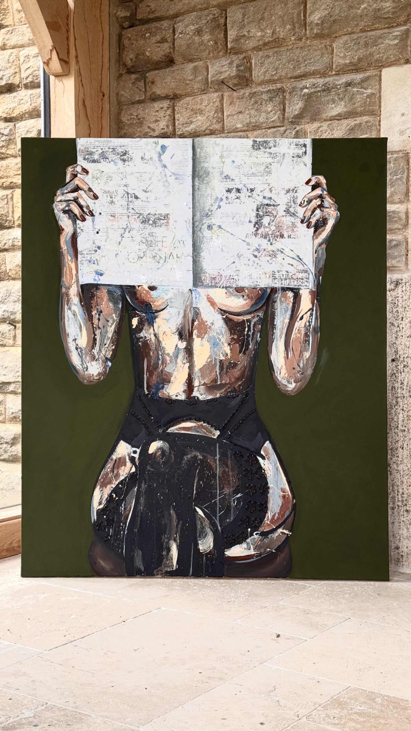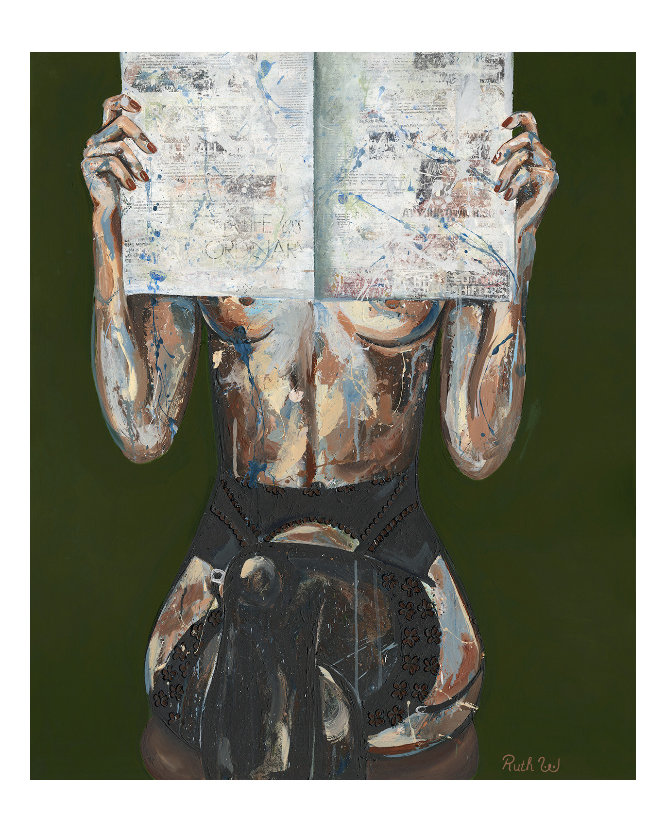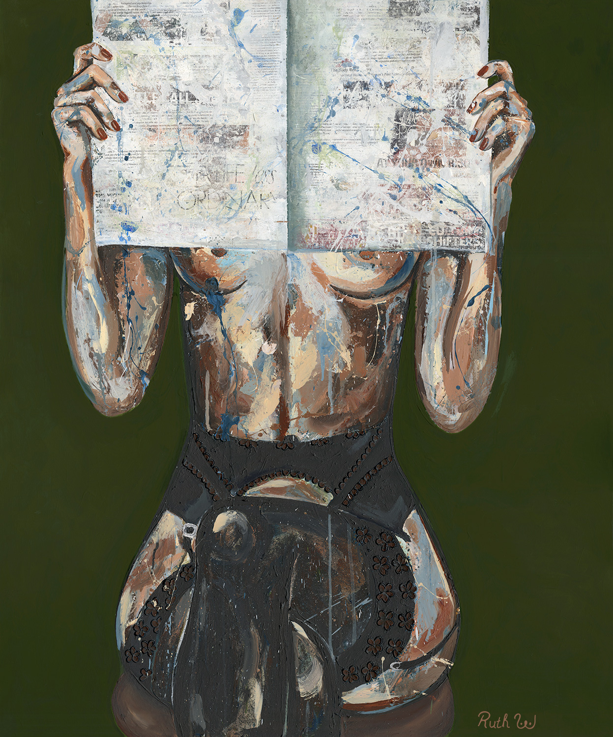 At the centre of the painting a woman holds a newspaper in front of her face. The act of reading signifies knowledge and engagement with current power structures, while its obscured text denies the viewer access.