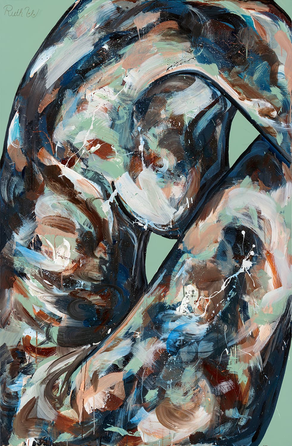 The figure is curled inward, a familiar posture of discomfort and withdrawal. She carries the same colours as the background, creating a subtle sense of chaos and overlap. This blending reflects how women's symptoms are frequently overlooked, misunderstood or attributed to something else entirely.