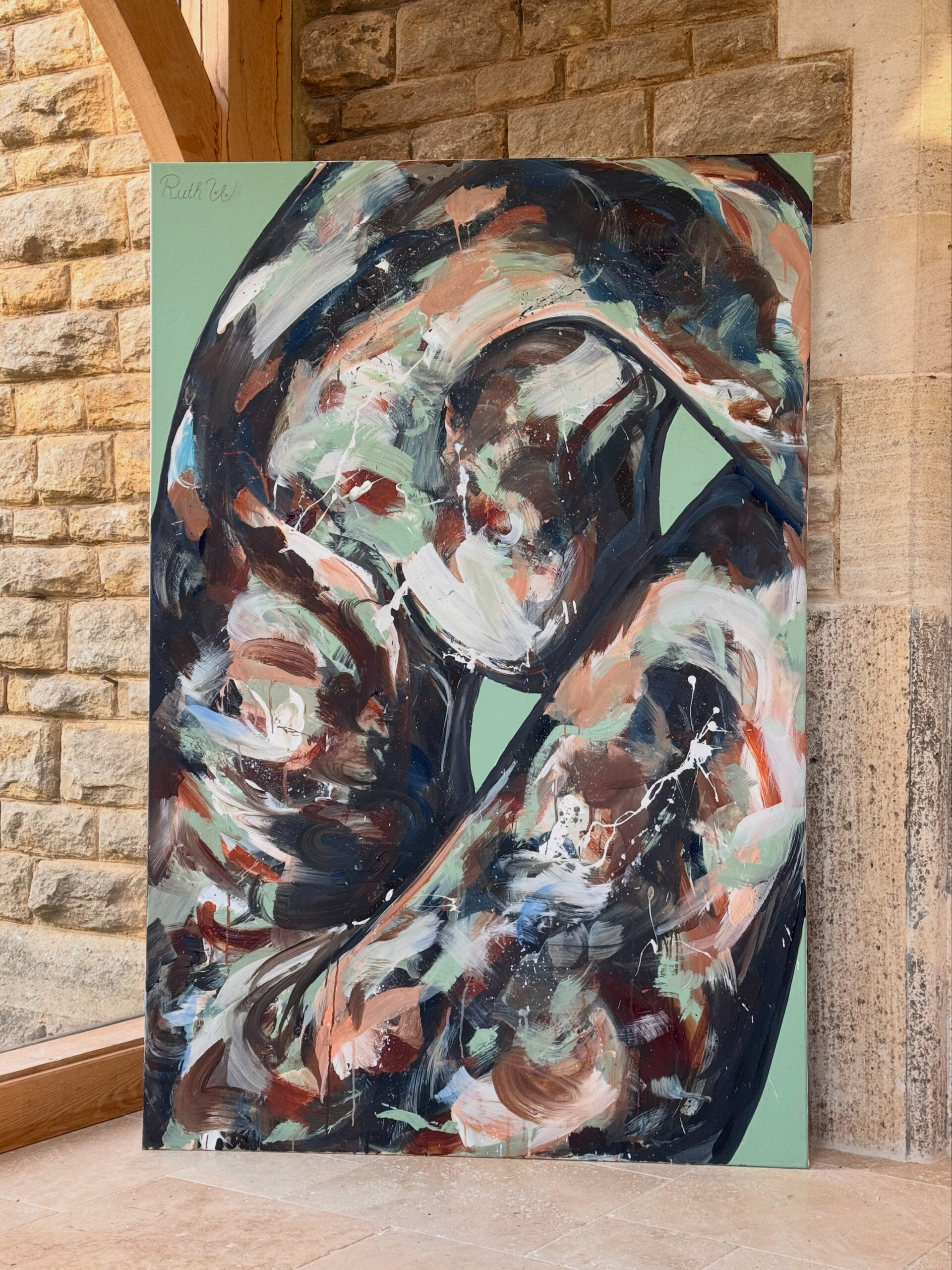 Abstract strokes of blues, greens and soft neutrals form her shape, creating a feeling of self containment. With no sharply defined outlines, her body dissolves into the background. this intentional lack of clarity reflects the uncertainty surrounding women's health when pain is minimised or dismissed.