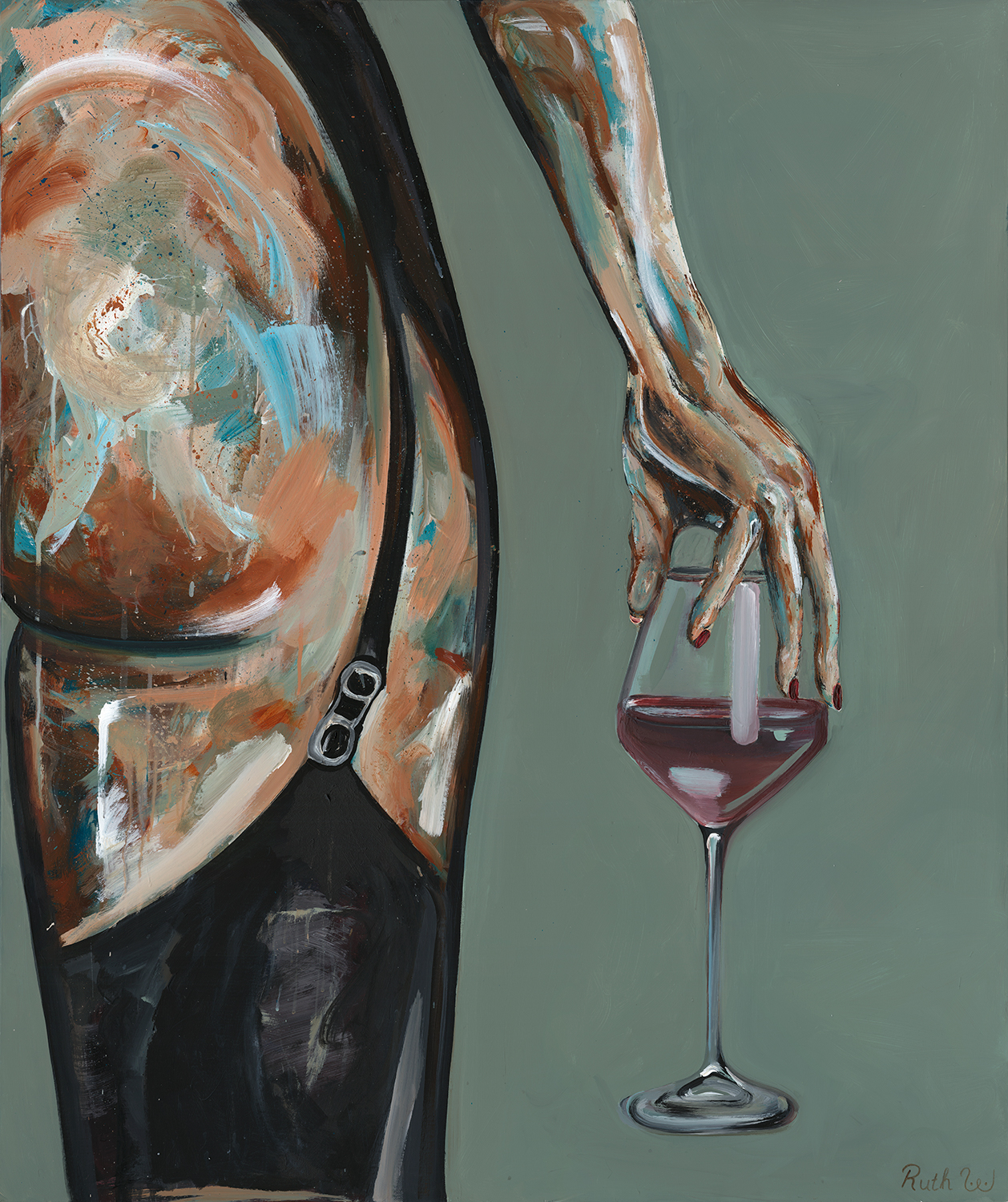 The cropped composition established intimacy while holding boundaries. You are invited to be close but never granted full access. Her relaxed hand and grounded posture convey ease rather than seduction. The lingerie frames femininity as self-owned, not performed. The red wine acts as an anchor to the piece, adding warmth and depth, quietly shifting the mood towards introspection and sensual confidence.